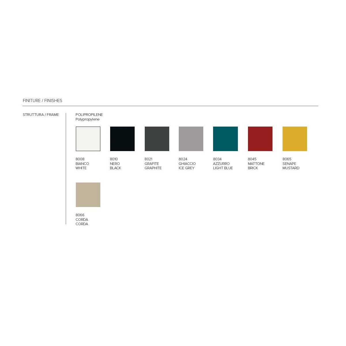 Bianco, Nero, Grafite, Ghiaccio, Azzurro, Mattone, Senape, Corda